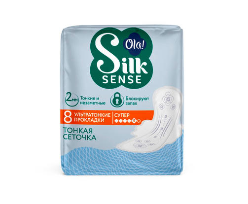 Ola silk sense прокладки ультратонкие для обильных выделений шелковая сеточка 8 шт. - женские прокладки для критических дней ультратонкие, без аромата. Ультратонкие прокладки для критических дней размера «Супер» - тонкая сеточка, тонкие и незаметные. Быстро впитывают влагу, препятствуя прохождению ее обратно на поверхность. Суперабсорбент в составе ядра прокладки быстро превращает жидкость в гель, удерживая ее внутри и предотвращая протекания и появление неприятного запаха. Таким образом, поверхность прокладки остается сухой, даже если содержит большое количество жидкости. Тонкая сеточка на поверхности не вызывает раздражений и мгновенно пропускает жидкость. Широкие тройные крылышки обеспечивают надежное крепление прокладки к белью. Толщина прокладки всего 2 мм, что делает ее совсем незаметной даже под обтягивающей одеждой. Рекомендуется менять прокладку не реже, чем каждые 4 часа. Бренд Ola! - это современная и высокотехнологичная продукция средств женской гигиены 150,00 ₽ / шт