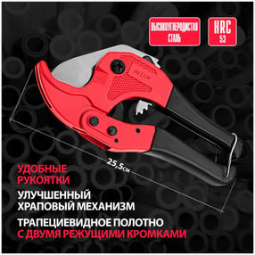 Ножницы Matrix 784105 предназначены для резки изделий из пластика диаметром или шириной до 42 мм — поливинилхлоридных труб, профилей, плинтусов, галтелей, а также резиновых шлангов и других предметов. С этими задачами они успешно справляются благодаря трапециевидному полотну с двумя режущими кромками. Инструмент используется во время сантехнических и отделочных работ. Преимущества Рабочая часть изготовлена из высокоуглеродистой стали, поэтому характеризуется прочностью и долговечностью. Твердость режущей кромки составляет 53 HRC, поэтому лезвие долго сохраняет остроту. Улучшенный храповый механизм облегчает работу с инструментом. В случае износа рабочего ножа его можно заменить. Обрезиненные обливные рукоятки с порошковым покрытием не выскальзывают из руки, что повышает комфорт во время работы. Фиксирующее кольцо удерживает рукоятки в нерабочем положении, что удобно для хранения и транспортировки. 1 142,00 ₽ / шт