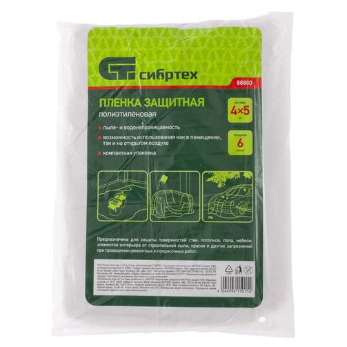 Защитная полиэтиленовая пленка Сибртех 88800 плотностью 6 мкм и размером 4 х 5 м используется для защиты предметов и поверхностей, на которые может попасть пыль или мусор в процессе ремонтно-строительных работ. С ее помощью можно предотвратить загрязнение оконных рам, напольных покрытий, мебели и т.д. Преимущества Безопасность — пленка не содержит посторонних примесей. Электростатичность — полиэтиленовая пленка легко принимает форму поверхностей. Долговечность — за счет своих прочностных характеристик пленка не деформируется при натяжении. Надежность — укрывной материал не пропускает воду и химические вещества. Универсальность — пленка может использоваться снаружи и внутри помещений. Удобство хранения и транспортировки — изделие продается в компактной упаковке. 210,00 ₽ / шт