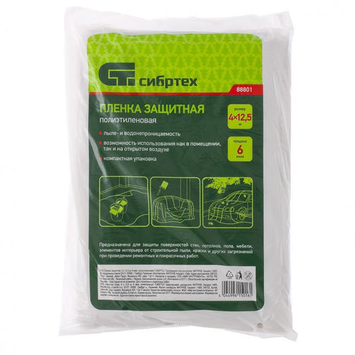 Пленка защитная,4х12,5м,6 мкм,полиэтиленовая//Сибртех 88801