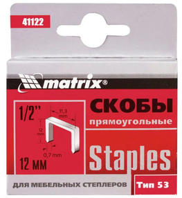 Скобы Matrix 41122 размером 12 х 11,3 х 1 мм, тип 53, 1000 шт. в упаковке, предназначены для скрепления материалов при помощи мебельного степлера. Подходят для работы с древесиной, фанерой, картоном, ДСП, оргалитом и т. д. Будут полезны во время ремонтных и отделочных работ, пригодятся для обшивки мебели. Преимущества Высокая прочность — стальные скобы можно использовать не только с мягкими, но и твердыми материалами. Защита от коррозии — оцинкованные изделия не разрушаются под воздействием влаги. Универсальность — расходники совместимы со степлерами Matrix 40902, 40903, 40907 и аналогичными моделями. Комфортная работа — скобы с заостренными наконечниками легко вбиваются в материал. 1000 шт. в коробке — одной упаковки хватит на большой объем работ. 115,00 ₽ / шт