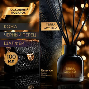 Ароматические диффузоры Terra Mystica – это премиальная коллекция ароматов для дома от ведущих европейских парфюмеров. Изысканные, загадочные, роскошные композиции для истинных ценителей высокого качества жизни. Аромат «Essense» - это теплый и дерзкий шлейф кожи в верхних нотах в сочетании с терпкой остротой черного перца и легкой пряностью шалфея, приоткрывающий завесу тайны в сущность (Essence) бытия. Флаконы в дымчатом градиентном прокрасе и элегантные палочки глубокого черного цвета откроют путь к эксклюзивной парфюмерной композиции «Essence». Стильная черная упаковка с текстурой кожи выглядит роскошно и станет прекрасным подарком как для НЕЁ, так и для НЕГО. Используя разное количество палочек можно удобно регулировать интенсивность аромата в помещении: чем больше палочек вставлено в диффузор, тем сильнее и насыщеннее распространяется аромат. Стойкость аромата до 6 недель, в зависимости от помещения и интенсивности использования. Коллекция парфюмов для дома Terra Mystica погрузить в атмосферу роскоши, уюта и станет завершающим элементом, которого так не хватало для создания идеальной картины в интерьере. Подчеркните вашу индивидуальность вместе с ароматическими диффузорами Terra Mystica! 1 300,00 ₽ / шт
