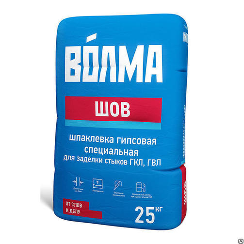 «ВОЛМА-Шов» - сухая шпатлевочная смесь на основе натурального гипса, минерального наполнителя и модифицирующих добавок для заделки стыков ГКЛ, ГВЛ. 592,00 ₽ / шт