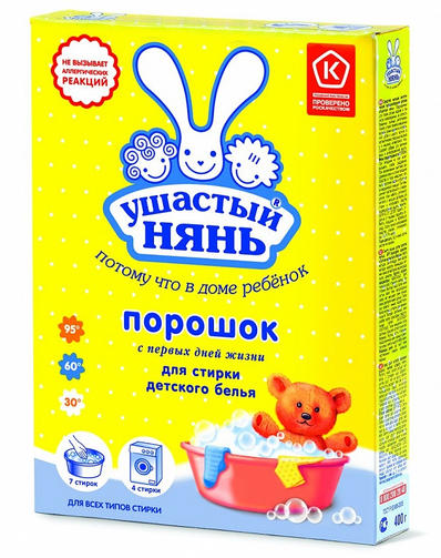 Стиральный порошок "Ушастый нянь" разработан для стирки белья и одежды детей любого возраста, в том числе новорожденных. Также подходит для стирки одежды людей с чувствительной кожей. начинает действовать уже в процессе замачивания и удаляет загрязнения даже в воде низкой температуры; эффективно справляется с широким спектром загрязнений, удаляет пятна от молока, яиц, фруктовых пюре, соков, каш, а также от продуктов жизнедеятельности малышей; подходит для стирки белья из хлопчатобумажной, льняной, синтетической ткани, а также тканей из смешанных волокон (кроме натурального шелка и шерсти); мягкие отбеливатели и низкий pH не повреждают структуру волокон тканей, что позволяет сохранить первоначальный вид одежды в процессе многократных стирок; порошок не содержит мыла, что позволяет ему полностью и без труда выполаскиваться из белья; нежный запах порошка сделает стирку приятной, но не останется на белье; специальные компоненты в составе защитят нагревательные элементы стиральной машины от накипи. Благодаря этим особенностям стиральный порошок «Ушастый нянь» может быть рекомендован даже для детей, склонных к аллергии, что подтверждают специалисты ФБУН «Северо-Западный научный центр гигиены и общественного здоровья» (г. Санкт-Петербург) . Стиральный порошок «Ушастый нянь» получил знак "Роскачества" в 2019 году как товар повышенного качества. rosk.jpg Активные компоненты Энзимы (ферменты) удаляют загрязнения и пятна различного происхождения. Оптический отбеливатель придает интенсивную белизну ткани. Активный кислород (кислородосодержащий отбеливатель) способствует удалению отбеливаемых пятен (чай, кофе, вино). 103,87 ₽ / шт