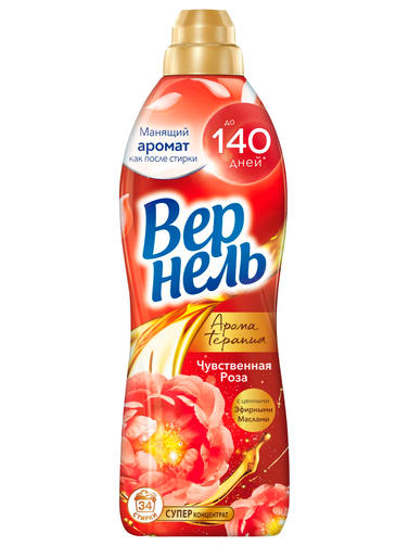 Кондиционер для белья Ароматерапия Чувственная роза 870мл подарит вашему белью невероятную мягкость. В его состав входят специальные аромакапсулы, которые раскрываются в процессе полоскания, придавая чистым вещам неповторимый чувственный аромат розы (неиспользованные изделия сохраняют его до 140 дней). Формула средства содержит эфирные масла, благодаря чему оно благотворно влияет на состояние души и тела. Кроме этого, оно оказывает антистатический эффект и облегчает глажение. Прекрасно подходит для всех видов тканей. Экономично расходуется: на одну стирку достаточно меньше половины колпачка. Этого флакона вам хватит примерно на 34 стирки. Избегайте непосредственного контакта кондиционера с тканью. Подходит для всех видов тканей. Избегайте непосредственного контакта средства для стирки с тканью. Концентрированный ополаскиватель для белья Вернель просто использовать. Благодаря удобной крышке-дозатору Вы всегда будете знать, сколько ополаскивателя для белья необходимо добавить в отделение для кондиционера в стиральной машине или в воду во время последнего полоскания при ручной стирке. Концентрированного средства для стирки хватает на длительное время. Его не нужно разбавлять водой. Перед использованием рекомендуется взбалтывать. Информация по дозировке указана на обратной стороне упаковки средства для стирки. Бренд Вернель берет начало в 1969 г когда своим появлением Вернель объявил войну жесткости сухого белья. Благодаря концентрированным ополаскивателям для белья Вернель , компания Henkel подарила своим потребителям невероятное ощущение мягкости вместе с удивительной свежестью и приятным ароматом. 214,56 ₽ / шт