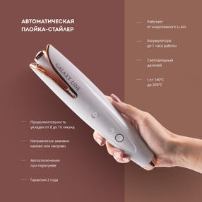 С автоматической аккумуляторной плойкой GALAXY LINE GL4634 Вы будете потрясающе выглядеть в любых обстоятельствах. Плойка-стайлер работает от энергоемкого Li-ion аккумулятора до 1 часа в непрерывном режиме при температуре 140 °С. Вы можете взять плойку с собой в офис или в поездку. Делайте укладку в любое удобное время и в любом удобном месте. Завивка с помощью беспроводной плойки GALAXY LINE не только удобна, но и безопасна. Камера для автоматической укладки имеет керамическое покрытие, которое равномерно распределяет тепло и запечатывает влагу внутри чешуек волос, сохраняя их здоровье и блеск. Дополнительным преимуществом плойки-стайлера GL4634 является наличие регулятора температуры от 140°С до 200°С и регулятора продолжительности укладки от 8 до 16 секунд. Также плойка позволяет выбрать направление завивки: налево или направо. Все это дает возможность выставить необходимый режим в зависимости от структуры ваших волос, длины стрижки и особенностей укладки. Все настройки отображаются на светодиодном дисплее. Диаметр плойки 22 мм позволяет создать средние натуральные и мелкие эффектные кудри. Стильная, красивая и компактная плойка GALAXY LINE станет замечательным дополнением дамской сумочки. Будьте ухоженными и мобильными всегда и везде с плойкой GALAXY LINE GL4634 3 990,00 ₽ / шт