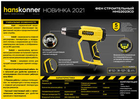 HHG2023CD Фен технический Hanskonner, 2300Вт, 50/50-650C, 250-500л/мин, КЕРАМИКА, ЖК-дисп, кейс