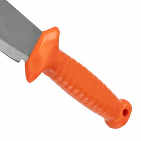Туристическое мачете арти 60401, 490 мм, с пластиковой рукояткой и жестким чехлом в комплекте — это универсальный инструмент, который пригодится как в хозяйстве, так и в туристических походах. Его можно использовать для рубки стеблей кукурузы, подсолнечника, сорняков с толстыми стеблями, мелкой поросли кустарника, мелких дров и для прорубания троп в зарослях. Преимущества Надежность и долговечность мачете достигается за счет утолщенного полотна из кованной рессорно-пружинной стали, закаленной до твердости 40-46 HRC. Полотно с односторонней заточкой обеспечивает высокую режущую способность мачете. Для предотвращения коррозии полотно покрыто защитным лаком. Пластиковая рукоятка имеет специальные упоры и рифление для надежного хвата без проскальзывания. Мачете поставляется в жестком чехле, покрытым водоотталкивающей пропиткой и имеющим поясной подвес для безопасной и удобной транспортировки. 1 930,00 ₽ / шт