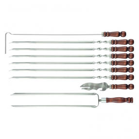 Предназначен для приготовления шашлыка из мяса, птицы, овощей. Особенности Деревянная рукоятка.. Нержавеющая сталь Преимущества Безопасен во время эксплуатации. Удобно переворачивать и снимать шампур с мангала. Винт у основания шампура позволяет надёжно фиксировать его в пазах мангала, не даёт ему прокручиваться. Увеличенная толщина шампура не позволяет сгибается и деформироваться под тяжестью нанизанных продуктов. Обработка и полировка металла обеспечивает гладкую поверхность. КомплектацияШампуры плоские, размер 650x12x2,5 мм. Кочерга, размер 600x12x2 мм. Вилка-шампур, размер 650x2x12x2 мм. Нож шампурный размер, 270x45x2 мм. Поставляется в комплекте в чехлом 2 400,00 ₽ / шт