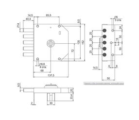 Замок накладной сувальдный. Предназначен для установки на металлические двери. Засов из пяти цилиндрических ригелей диаметром 14 мм, с максимальным вылетом 40 мм. Удаление ключевого отверстия - 68 мм. Количество оборотов ключа - 4. Габариты замка - 138х152х20 мм. Комплектация - 5 ключей, накладка из полированной нержавеющей стали, пластмассовая шторка. В одном из ригелей расположен закаленный стальной стержень, обеспечивающий надежную защиту от перепиливания. Защита от криминального и силового взлома, высверливания, выдавливания. 2 810,00 ₽ / шт