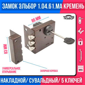 Замок накладной ЭЛЬБОР Кремень 1.04.61.КМА медный антик Замок накладной, 3 стержня Ø 14 мм, никель, запорная коробка, медный антик Выход стержней — 21,5 мм Габаритные размеры — 85,4×81,9×18мм Диаметр стержня — 14 мм Класс замка — 3 класс по гост 5089-2003 Количество сувальд — 6 Количество штук в групповой упаковке — 10 Масса брутто одного замка — 0,79 кг Механизм секретности — сувальдный Общая площадь поперечного сечения стержней — 461,58 мм2 Комплектация Замок в сборе Комплект накладок Комплект крепежа Запорная коробка Руководство по эксплуатации: 1 шт 2 255,00 ₽ / шт