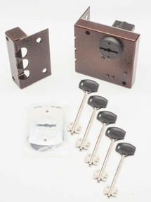 1.04.61.К.МА Замок накладной КРЕМЕНЬ, никель, сувальдный-стержни 3шт. диаметр 14мм, медный антик