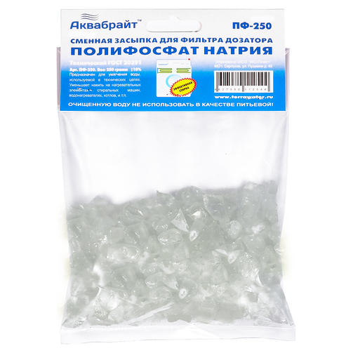 Кристаллы полифосфата предназначены для засыпки в фильтры установленные перед стиральными машинами. Полифосфат уменьшает расход стирального порошка и предотвращает отложение накипи на нагревательных элементах. 280,00 ₽ / шт