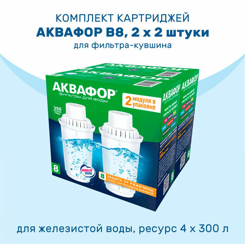 Аквафор В8 (В100-8) Ресурс каждого модуля в комплекте - 350 литров. Когда один закончится, вы сможете заменить его за несколько минут. С картриджем В8 (В100-8) в фильтре-кувшине, у вас всегда есть свежая чистая вода, чтобы готовить для ваших близких. 550,00 ₽ / шт