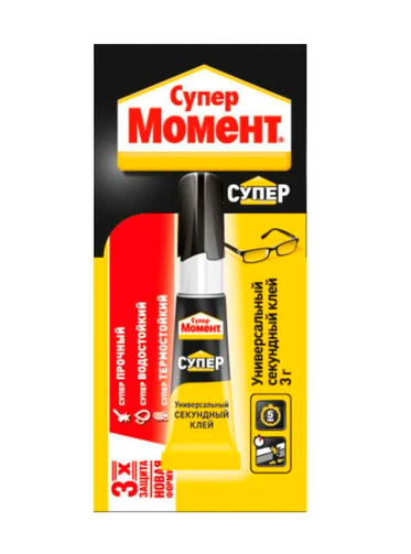 Супер клей Момент используют для быстрого склеивания таких материалов, как фарфор, керамика, дерево, кожа, резина, металл, пробка, картон и большинство пластиков. В составе данного клея — смола эпоксидная. Склеивание осуществляется всего за 5 секунд. Благодаря прозрачному составу место склеивания совсем незаметно. сверхпрочный клеевой шов выдерживает нагрузку до 200 кг на см2. Хранить необходимо в сухом месте при температуре от -20 ºС до +30 ºС. Поставляется на блистер-карте. 150,00 ₽ / шт