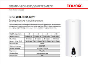 Водонагреватель накопительный 50 литров теплокс нерж-круг- 50 Электрический накопительный водонагреватель теплокс серии ЭНВ-НЕРЖ-КРУГ представляет собой прибор, который используется для нагрева и последующего поддержания заданной температуры воды (в автоматическом режиме) в водонапорной системе дома (квартиры). С помощью нагревательного элемента (ТЭНа) вода в водонагревателе нагревается и поступает к точкам потребления. Накопительный водонагреватель (бойлер) может использоваться для одновременного разбора нагретой воды в нескольких точках потребления (умывальник, душ, ванна). ! Данный накопительный водонагреватель НЕ предназначен для работы в непрерывном проточном режиме. Как подобрать водонагреватель>>> Характеристики: Габаритные размеры (В х Ш х Г) - 762 х 340 х 362 мм. Объём внутреннего накопительного бака - 50 литров Мощность ТЭНа - 2000 Вт Время нагрева воды полного бака 30 литров: с +15º С до +75º С - до до 1 часа 20 минут Автоматическое поддерживание заданной температуры воды Стабильная работа при мин. давлении воды Корпус белого цвета Накопительный внутренний бак из нержавеющей стали Цифровой дисплей Защита от перегрева Защита от включения при отсутствии воды Оболочка ТЭНа из меди Магниевый анод Диапазон регулировки нагрева воды от +15° до +75° С Давление воды максимальное до 6 атм. Подключение воды - 1/2 дюйма УЗО (устройство защиты) в комплекте Гарантия - 5 лет** (на накопительный бак) 13 700,00 ₽ / шт