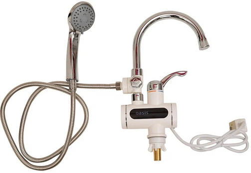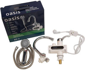 Электрический проточный водонагреватель Oasis EP-3 - это отличное решение при отсутствии централизованной горячей воды. Подобный смеситель-водонагреватель станет отличным приобретением для дачи, квартиры, загородного дома. Он имеет стильный и современный дизайн, практически не отличается от обычного крана и его легко установить самостоятельно. Простота и надёжность. Мощный нагревательный элемент обеспечивает моментальный нагрев воды до 60°С, в зависимости от температуры входящей воды и напора. Небольшие габаритные размеры, совпадающие с обычными смесителями, позволяют легко установить электронагреватель в ванну. Благодаря душевой лейке, идущей в комплекте, можно принимать душ. Удобная регулировка температуры выходящей воды и цифровой дисплей, отображающий температуру воды, обеспечивают комфортное использование прибора. Конструкция излива предоставляет возможность его поворота на 360 градусов. Основные компоненты прибора, соприкасающиеся с водой, выполнены из нержавеющей стали, устойчивой к образованию коррозии. Устройство защитного отключения обеспечивает безопасность при эксплуатации прибора, прекращая подачу электричества в случае поломки. Электрические проточные водонагреватели Oasis - комфорт и надёжность в одном устройстве. 7 961,80 ₽ / шт