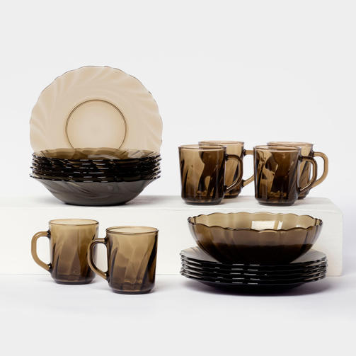 Посуда Ca del vetro - это изысканный и стильный элемент, который привнесет нотку элегантности в любой интерьер. Ее корпус выполнен из качественного термостойкого стекла, что позволяет использовать посуду для горячих, так и для холодных блюд/напитков. Преимущества: Практичность и долговечность. Экологическая безопасность. Не впитывает запахи. Изящность и привлекательность. Эксплуатация: Мыть губкой или специальной мягкой щеткой. Осторожнее с посудомоечной машиной - желательно мыть стеклянные тарелки, бокалы при температуре чуть выше комнатной. После мытья поместить на решетчатую стойку, чтобы вода стекала вниз. Полировать нужно мягким материалом без ворса, одним полотенцем взять предмет, другим полировать. Комплектация 19 предметов: Тарелка обеденная d=21 см — 6 шт; Тарелка суповая d=20 см — 6 шт; Кружка 230 мл — 6 шт; Салатник d=20 см — 1 шт. 2 690,13 ₽ / шт