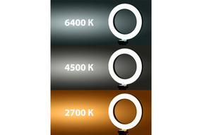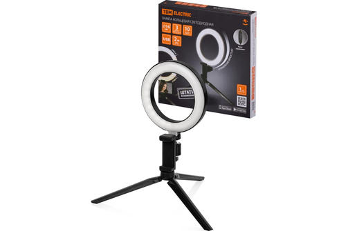 Лампа кольцевая светодиодная 16 см, 6 Вт, 2700-6400 К, штатив наст., диммер, USB, TDM SQ0373-0301 Назначение: Для освещения объектов фото- и видеосъмки. Конструкция: Кольцевая лампа в комплекте с настольным штативом и держателем для телефона. Материалы: АБС-пластик, металл. Преимущества: 3 цветовые температуры белого света (3000, 4500 и 6500 К) и 10 уровней яркости для создания идеального оттенка кожи модели. RGB- светодиоды для создания 21 светового эффекта без использования дополнительных фильтров. Возможность выбора скорости переключения цвета в динамических режимах. Гибкий держатель для смартфона с шарнирным креплением позволяет установить камеру под любым нужным углом. Кабель питания с разъемом USB для подключения лампы к совместимому адаптеру или внешнему аккумулятору. Раздвижной держатель подходит к большинству популярных моделей смартфонов с шириной от 55 до 80 мм. Штатив и держатель могут быть отсоединены для использования лампы в качестве заливающего света при макросъемке зеркальной камерой. Интуитивно понятное управление с помощью пульта на кабеле питания и инфракрасного пульта ДУ. 960,00 ₽ / шт