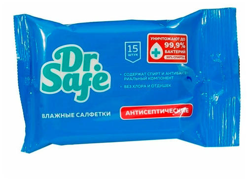 Антибактериальные салфетки Dr.Safe идеально подойдут для ежедневного использования в целях защиты от вредных микроорганизмов. Применяются в условиях, когда нет возможности тщательно вымыть руки. На работе, на природе, в общественных местах антибактериальные салфетки станут вашим защитником от повсеместно окружающих человека вредоносных микроорганизмов. \nАнтибактериальные компоненты пропитки салфеток, нейтрализуют до 99% микроорганизмов, препятствуя их размножению. Благодаря особой формуле антибактериальный состав эффективно распространяется по всей поверхности. Быстро впитывается и не требует ополаскивания. \nЭкстракт ромашки обладает антибактериальным, противовоспалительным эффектом, увлажняет кожу, бережно относится к особо чувствительным ее участкам. \nАнтибактериальные салфетки обладают быстродействующим свойством, эффективно защищая вас от возможных заболеваний. \nСалфетки поставляются в удобной и компактной герметичной упаковке, позволяющей сохранить необходимую влажность и полезные свойства изделия на протяжении всего срока использования. 25,35 ₽ / шт