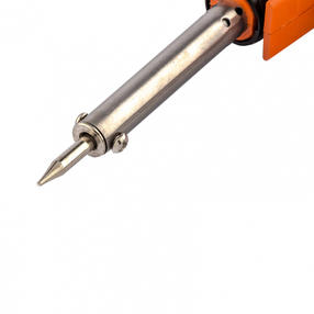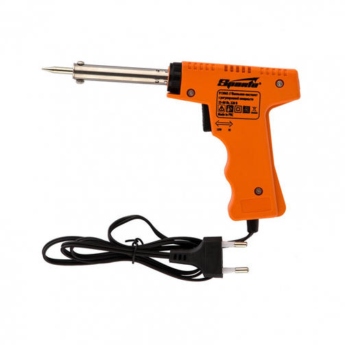 Паяльник-пистолет Sparta 913065 с регулировкой мощности 25-80 Вт питается от сети 220 В и предназначен для пайки микрочипов, транзисторов, электросхем, кабелей. Благодаря керамическому нагревательному элементу подходит для длительной непрерывной работы. Съемное жало может быть заменено в случае необходимости. Температура нагрева регулируется нажатием кнопки на рукоятке. Простой в применении прибор пригодится электромонтерам, радиолюбителям, автоэлектрикам, а также будет полезен в быту. Преимущества Медное жало быстро разогревается, поэтому прибор не требует длительной подготовки к работе. Материал рукоятки — древесина с низкой теплопроводностью, поэтому она меньше нагревается по сравнению с пластиковыми. Деревянная рукоятка удобно лежит в руке, обеспечивая комфорт при длительной работе. В комплект входит подставка для размещения на ней прибора во время работы. 600,00 ₽ / шт