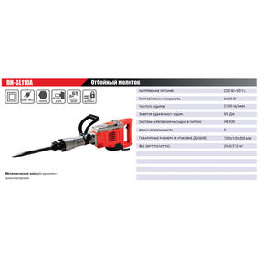 Молоток отбойный электрический Edon DH-GL110A предназначен для разрушения строительных конструкций из бетона, кирпича и аналогичных материалов, вскрытия асфальтовых и бетонных покрытий, рыхления твердых и мерзлых грунтов и т.д. Основные характеристики: Напряжение - 220 В.; Частота - 50 Гц.; Максимальная потребляемая мощность - 2400 Вт.; Количество ударов - 2100 уд/мин.; Сила удара - 65 Дж.; Установочный размер хвостовика - 30 мм. Комплектация: - отбойный молоток - 1 шт.; - насадка «пика» - 1 шт.; - насадка «лопатка» - 1 шт.; - ключ крышки смазочной камеры – 1 шт.; - имбусовый ключ - 1 шт.; - тюбик смазки - 1 шт.; - комплект запасных щеток - 1 комп.; - руководство по эксплуатации - 1 шт.; - металлический кейс - 1 шт. 23 760,00 ₽ / шт