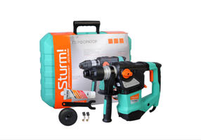 Sturm RH2518 – производительный универсальный перфоратор бытового назначения. Имеет вертикальную компоновку, которая предполагает установку мощных двигателя и механической части при сохранении умеренных габаритных размеров корпуса. Инструмент обладает отличной развесовкой, за счет чего достигается его уверенный контроль, а также тщательно проработанной эргономикой. Дополнительный комфорт обеспечивает специальный антивибрационный демпфер, значительно снижающий уровень вибрации при работе. Модель оснащена мощным 1850 Вт электромотором и ударным механизмом, развивающим высокую энергию удара в 7 Дж – это позволяет быстро и эффективно бурить сквозные отверстия диаметром до 36 мм в материалах различной твердости, включая камень и различные марки бетона. При необходимости, возможно использование полых коронок больших диаметров (бетон – 68 мм / кирпич – 90 мм). Для обеспечения высокого ресурса инструмента особое внимание уделено наиболее нагруженным элементам конструкции: электромотор покрыт несколькими изоляционными слоями термостойкого лака с дополнительным бронированием армирующей нитью, защищающей от воздействия абразивных частиц, шестерни редуктора изготовлены из высококачественной стали и подвержены закалке, усилен ударный механизм, подшипники и пусковая кнопка имеют пылезащиту. Корпус редуктора и ствол ударной части выполнены из литого алюминия, за счет чего обеспечивается лучший теплоотвод от элементов ударного механизма, во избежание перегрева при непрерывной эксплуатации. За безопасность использования отвечает предохранительная кулачковая муфта, исключающая опасность проворачивания инструмента в руках при заклинивании оснастки в материале. Перфоратор Sturm RH2518 имеет три режима работы: сверление, сверление с ударом, либо режим удара. Предусмотрена функция установки долота в нужном угловом положении. Для комфортной эксплуатации инструмента в холодное время года сетевой кабель перфоратора имеет резиновую изоляцию, что позволяет сохранить его гибкость и эластичность в условиях низких температур. Удобство хранения и транспортировки обеспечивает штатный пластмассовый кейс. Назначение: для эффективного бурения отверстий в бетоне / кирпиче, штробления, демонтажных работ: снятия стяжки, плитки, штукатурки и т. д. 11 990,00 ₽ / шт