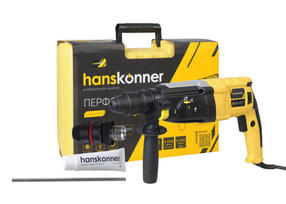 Hanskonner HRH0828REС – универсальный трехрежимный перфоратор. Имеет классическую горизонтальную компоновку с продолговатым узким корпусом и небольшую массу, за счет чего максимально удобен при высотных работах, а также при эксплуатации в условиях с трудным доступом. Главная отличительная черта модели Hanskonner HRH0828REС – возможность быстрой смены патронов под разные типы используемой оснастки: одним движением пользователь может заменить патрон под оснастку с типом хвостовика SDS Plus, на аналогичный, рассчитанный под цилиндрический хвостовик и обратно. Модель оснащена двигателем мощностью 850 Вт и усиленным вакуумно-компрессионным механизмом, развивающим энергию удара – 3.2 Дж – это позволяет уверенно бурить отверстия диаметром до 28 мм в материалах различной твердости, включая кирпичную кладку, камень и бетон, а также использовать корончатые сверла больших диаметров (до 68 мм). Универсальность применения обеспечивают три режима работы – в зависимости от конкретной задачи пользователь выбирает нужный: сверление, сверление с ударом, либо режим удара. Смена режимов происходит поворотом специального переключателя. Помимо трех рабочих режимов предусмотрен еще один дополнительный, дающий возможность установки долота в любом угловом положении. Для безопасности пользователя в перфораторе установлена предохранительная кулачковая муфта SafetyClutch – она позволяет избежать обратного удара в случае заклинивания оснастки, а также страхует от повреждений сам инструмент. Важной особенностью модели Hanskonner HRH0828REС является конструкция механизма реверса с поворотным щеткодержателем – данное техническое решение способствует увеличению срока службы щеток, а также позволяет развивать максимальные обороты на валу, как при прямом, так и реверсивном вращении. Сетевой кабель имеет резиновую изоляцию, что позволяет сохранить его гибкость и эластичность в условиях низких температур, а четырехметровая длина кабеля дает возможность использовать инструмент без применения дополнительного сетевого удлинителя, обеспечивая рабочую зону площадью до 50 квадратных метров. Шарнирное крепление кабеля обеспечивает его стойкость к изломам, способствуя долгому сроку службы. Инструмент штатно оснащается пластиковым кейсом для удобства хранения и транспортировки. 11 990,00 ₽ / шт