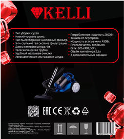 KL-8019/Синий. Пылесос KELLI – это мощный и удобный прибор для сухой уборки, который обеспечивает высокое качество уборки и низкий уровень шума. Удобный механизм очистки позволяет легко удалять загрязнения с поверхности, в то время как потребляемая мощность составляет 2600 Вт, а мощность всасывания 450 Вт. Объем пылесборника составляет 2,5 л, что позволяет комфортно провести уборку без необходимости постоянно перерабатывать пылесос. Этот пылесос оснащен циклонным фильтром и 5-ти ступенчатой системой фильтрации, что позволяет эффективно удалять пыль и частицы из воздуха. Пластиковая телескопическая трубка, которая поможет Вам убрать пыль и грязь. Управление пылесосом осуществляется с помощью переключателя ВКЛ/ВЫКЛ, а также благодаря автоматическому сматыванию шнура. Особенностью данного пылесоса является наличие колес для легкого перемещения и защитой от перегрева. Длина сетевого шнура составляет 4 метров, что позволяет обеспечить достаточную протяженность кабеля. При работе с этим пылесосом вы можете использовать сеть с напряжением 220-240 В и частотой 50 Гц. Мы предлагаем Вам на выбор две расцветки: синий или красный. Каждый товар KELLI купленный в нашем магазине продается с гарантией на 1 год. 5 890,00 ₽ / шт