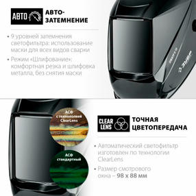 Преимущества -Автоматически затемняющийся светофильтр, -Степень затемнения: 5-8/9–13 DIN, в светлом состоянии: 3 DIN, -Скорость затемнения: 1/30000 сек, -Скорость высветления: 0,1 - 1,0 сек (регулируемая), -Защита от УФ и ИК лучей 13 DIN, -Возможность работать в режиме «Шлифование», -Поле зрения светофильтра: 98х88 мм, -Источник питания: cолнечная и Li-ion батарея, -Возможность ручной регулировки чувствительно Степень затемнения: 5-8/9–13 DIN, в светлом состоянии: 3 DIN Скорость затемнения: 1/30000 сек Скорость высветления: 0,1 - 1,0 сек (регулируемая) Защита от УФ и ИК лучей 13 DIN Возможность работать в режиме «Шлифование» Поле зрения светофильтра: 98х88 мм Источник питания: cолнечная и Li-ion батарея Возможность ручной регулировки чувствительности оптических датчиков и задержки затемнения Температурный режим работы от -5°С до +60°С Описание Сварочная маска ЗУБР предназначена для индивидуальной защиты головы, глаз и лица сварщика от прямых излучений сварочной дуги, искр и брызг расплавленного металла, от механических воздействий при выполнении сварочных работ, резки и пайки металла. Применение Сварочная маска предназначена для индивидуальной защиты головы, глаз и лица сварщика от прямых излучений сварочной дуги, искр и брызг расплавленного металла, от механических воздействий при выполнении сварочных работ, резки и пайки металла. 9 240,00 ₽ / шт