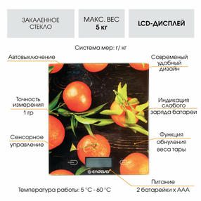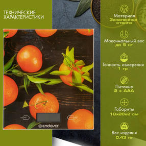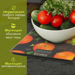 Яркие кухонные весы Endever Chief-504 с красивой и прочной поверхностью из закаленного стекла прекрасно дополнят интерьер Вашей кухни. Данная модель обеспечивает надежное взвешивание продуктов массой до 5 кг, а благодаря высокочувствительным датчикам, весы работают с точностью до 1 грамма. Модель имеет LCD дисплей и сенсорное управление, благодаря которым эксплуатация весов становится приятной и удобной. Весы Chief-504 позволяют взвешивать продукты в килограммах и граммах. Вам необходимо просто переключить на нужную единицу измерения. Также модель оснащена индикаторами заряда батареи и индикаторами перегрузки. Сенсорный экран управления предупредит Вас о превышении груза на весах, а также о необходимости заменить батарейки. В комплект входят 2 батарейки AAA. Благодаря функции обнуления тары, Вы можете взвешивать ингредиенты без учета посуды. А функция автоматического отключения поможет сэкономить Вам заряд батарей. Наличие прорезиненных ножек делает эту модель устойчивой на поверхности и не позволяет скользить. 1 050,00 ₽ / шт