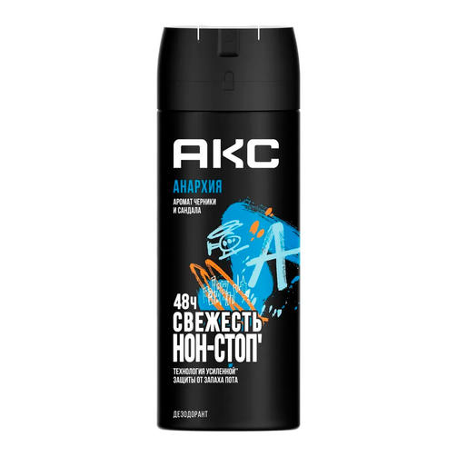 Дезодорант мужской спрей Акс Анархия создан специально для крутых парней, которым нужна полная уверенность в своем образе и стильный парфюм. Аэрозольный парфюмированный дезодорант мужской создан для тех, кто не боится стоять на своем, готов следовать за мечтой и привык действовать! Средство от запаха пота подмышек и тела имеет цитрусово-пудровый аромат, разработанный в сотрудничестве с одной из лучших мировых парфюмерных команд. Мужской дезодорант-спрей не оставляет белых следов и желтых пятен на одежде'. Дезодорант парфюмированный мужской Акс обеспечивает желанную свежесть и эффективный ежедневный уход коже подмышек. Легендарная* формула спрея Акс включает в себя два основных элемента защиты. Это надежная защита от запаха пота на 48 часов** и топовый* сладкий аромат. Аромат черники и сандала покоряет своей дерзкой сладостью, манит свежими нотами мандарина и ананаса, завораживая теплым ванильно-мускусным шлейфом. Нам кажется, именно так пахнет настоящий лидер, за которым хочется следовать. Аромат окутывает тебя роскошным парфюмерным облаком и остается на коже на весь день. Дезик мужской спрей станет изысканным дополнением к твоей коллекции средств личной гигиены. Дезодорант-спрей мужской содержит активный компонент против бактерий, вызывающих неприятный запах при потливости. Дезодорант Акс мужской не содержит солей алюминия и озоноразрушающих веществ. Дезодорант для мужчин Акс - это cruelty-free косметика, то есть не тестируется на животных. Акс дезодорант мужской нужно наносить после душа, чтобы не волноваться о чистоте и свежести на протяжении всего дня. Дезики-спреи хороши тем, что они более гигиеничны в использовании, чем другие форматы - с контактными аппликаторами. Используй дезодорант мужской парфюмированный Акс, и ты забудешь о следах и пятнах на любимой одежде'. Дезодорант мужской аэрозольный Акс освежит не только твой образ, но и мысли! Дезодорант для тела Акс - это отличный подарок для мужчин, парней, подростков. Купите дезодорант мужской Акс своему мужу, другу, коллегам на праздник и просто так. 350,00 ₽ / шт
