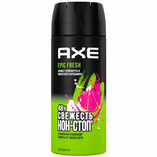 AXE Epic Fresh — дезодорант спрей с революционной формулой, который надежно защищает от запаха пота на 48 часов* и дарит топовый аромат**. Создан для мужчин, которые не боятся стоять на своем, готовы следовать за мечтой и привыкли действовать! Попробуй дезодорант мужской AXE и зарядись на победу: Смелый фужерный аромат со свежими нотами грейпфрута и пикантными аккордами кардамона останется с тобой на весь день и будет постепенно раскрываться на теле. Проверенная формула позволит коже дышать, но не даст ни единого шанса неприятному запаху. Дезодорант мужской спрей не содержит солей алюминия, поэтому он не оставит следов и пятен на одежде. Антибактериальная технология ZINK ZAP обеспечит надежную защиту от бактерий, появляющихся на коже при потоотделении, и продлит чувство свежести. Аромат, разработанный совместно с известным парфюмерным домом, вскружит голову и добавит уверенности. Мужской дезодорант AXE проверен дерматологами и идеально подойдет для ежедневного утреннего ухода. Также его можно использовать для любых ситуаций, когда нужно заявить о себе и создать правильное впечатление. Для максимального эффекта наноси средство сразу после душа. Смело выбирай любые образы, чувствуй себя на высоте и заряжайся уверенностью — а защиту от запаха пота доверь дезодоранту-спрею AXE Epic Fresh. Когда бы не наступил тот самый момент, ты будешь готов реализовать его на полную! 361,80 ₽ / шт