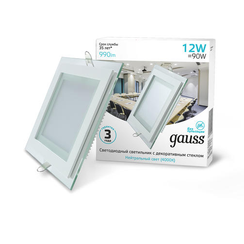 Светильник с/д Glass 12Вт 4000К IP20 990лм 220-240B ДВО квадр встраи с декор стеклом GAUSS 948111212