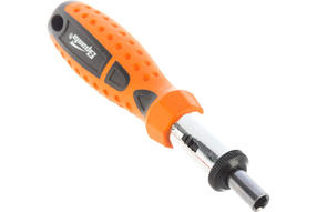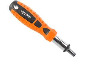 Реверсивная отвертка с шарниром Sparta 115565 входит в набор из 14 предметов, включающий также биты с хвостовиком 1/4 дюйма (тип С), торцевые головки и переходник для торцевых головок. Инструмент с насадками применяется для быстрого и эффективного монтажа/демонтажа резьбовых соединений. Реверсивный механизм значительно облегчает работу и снижает усталость рук, т.к. не требуется постоянно перехватывать ручку отвертки. С отверткой можно использовать любые биты длиной 25 мм. Комплект пригодится частным мастерам при проведении ремонтных работ. Преимущества Биты и торцевые головки из углеродистой стали характеризуются высокой прочностью и износостойкостью. Реверс позволяет менять направление вращения стержня для откручивания крепежа. Поворотная голова с пятипозиционной фиксацией обеспечивает возможность работы в труднодоступных местах и ограниченном пространстве. Двухкомпонентная рукоятка повышает удобство работы, т.к. не проскальзывает в руке. 700,00 ₽ / шт