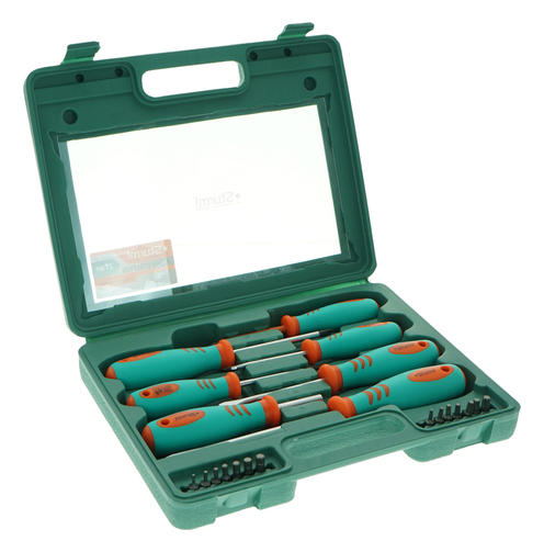 Набор отверток и бит Sturm! 21 предмет, в пластиковом кейсе-дисплее. В комплект входят: Отвертки SL5x75, SL6x100, SL8x150; PH1x75, PH2x100; Переходник для бит–10х50 мм; Отвертка диэлектрическая PH4x75 мм; 14 бит: ТORX: Т10, Т15, Т20, Т25, Т27, Т30, Т40; НEX2; НEX2.5; НEX3. НEX4. НEX5; НEX5.5; НEX6 Особенности Рабочие части изготовлены из хромованадиевой стали, что позволяет работать при высоких нагрузках. 2 070,00 ₽ / шт