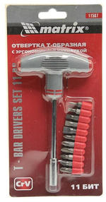 Отвертка с Т-образной эргономичной ручкой и набором бит, 11 шт, CrV Matrix 11567