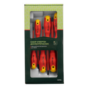 Набор диэлектрических отверток и тестер Сибртех 12936, CrV, с двухкомпонентными рукоятками, состоит из 7 предметов, которые пригодятся при обслуживании электрооборудования и электроприборов. Диэлектрическое покрытие защищает оператора от поражения током во время работ под напряжением до 1000 В. Широкий диапазон длины стержней отверток 80-125 мм позволяет выбрать оптимальную в зависимости от степени углубления крепежа. Важно — техника безопасности запрещает работу под напряжением даже при использовании инструмента с диэлектрическим покрытием! Преимущества Отвертки изготовлены из хромованадиевой стали, что является залогом их износостойкости и прочности. Тестер в комплекте позволяет проверить наличие напряжения в сети для безопасной работы. Эргономичные рукоятки с антискользящим покрытием надежно лежат в руке, что повышает удобство работы. Отвертки имеют специальные отверстия для подвешивания, поэтому их удобно хранить. Инструменты полностью соответствуют требованиям технического регламента Таможенного союза ТР ТС 010/2011. 1 310,00 ₽ / шт