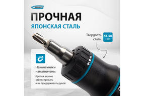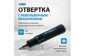 Реверсивная отвертка с револьверным механизмом Gross 11601 из стали S2, в наборе из 11 предметов, значительно повышает производительность работы при монтаже/демонтаже крепежа. За счет храпового механизма не нужно перехватывать руку или вынимать шлиц из крепежа, поэтому инструмент оптимален для профессионального использования. В качестве сменных насадок для отвертки можно применять любые биты длиной 25 мм с хвостовиком 1/4 дюйма. Преимущества Автоматическая подача насадок — магазин с револьверным механизмом позволяет максимально быстро и удобно менять биты. Долговечность — биты в наборе выполнены из прочной японской стали S2 твердостью 54-56 HRC, что обеспечивает их износостойкость. Надежная фиксация крепежа — наконечники бит намагничены, поэтому винт или саморез можно не придерживать рукой. Функция реверса — направление вращения меняется одним движением, что ускоряет работу. Работа в труднодоступных местах — специальный адаптер в комплекте позволяет удлинить биты при необходимости. Комфортная эксплуатация — удобная двухкомпонентная рукоятка не выскальзывает из руки. Гарантированное качество — на корпусе имеется фирменный штамп Gross, подтверждающий оригинальность продукта. 2 408,00 ₽ / шт