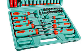 1040-02-SS10 Набор отверток 71 ПРЕДМЕТ, КЕЙС-ДИСПЛЕЙ Sturm! В комплект входят : отвертки SL: 3×75, 5×75, 6×100, 8×150; PH: 0×75, 1×75, 2×100, 3×150 ; держатель для бит 10×40 мм; диэлектрические отвертки: SL4×100, PH1×100; отвертки для точной механики: SL: 2×50, 2.5×50, 3×50;PH: 2×50, 2.5×50, 3×50; TORX: 6×50, 8×50, 10×50, 15×50, 20×50; 25 бит: PH: 0,1,2,3; SL:3,4,5,6,7 мм; PZ: 0, 1,2,3; TORX: 10,15,20,25,30,40; HEX: 2,3,4,5,5,56 мм; гибкий вал 250 мм; магнитный держатель для бит 60 мм; тестер напряжения; адаптер 50 мм; ручка с магнитом; торцевые головки: 5, 6, 7, 8, 9, 10, 11, 12, 13,5/ 32,3/ 16,1 /4,5/16,11/32,3/8,7/16,15/32,1/2". Особенности Стержни отверток изготовлены их хромованадиевой стали, что обеспечивает продолжительный ресурс работы. Хромоникелевое покрытие надежно защищает поверхность рабочей части отверток от коррозии. 4 680,00 ₽ / шт