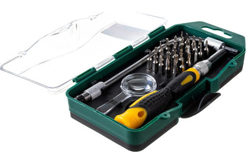 Отвертка с битами (для точных работ, 30 CrV бит, гибкий переходник 190 мм, лупа, в пластиковом футляре) FIT IT 56190 представляет собой универсальный инструмент, который удобен для работы с крепежом различного формата. При помощи отвертки и набора из 30 бит можно работать с мебельным и автомобильным крепежом, с электроникой (благодаря насадкам PH000 и PH00). Также для работы с мелкими деталями в наборе имеется лупа. Рукоятка не скользит в руке за счет специальных прорезиненных компонентов. Особенности отвертки FIT 56190 Компактное хранение FIT IT 56190 имеет небольшие размеры за счет компактного расположения всех объектов. Биты расположены систематически, для удобства поиска подходящего элемента. 1 180,00 ₽ / шт
