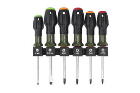 Сталь S257—61 HRCХромирование Состав набора: Шлиц 4×100; 6,5×100 мм Philips PH1×100; PH2×100 мм Pozidriv PZ1×100; PZ2×100 мм Пластиковый держатель Удобные в эксплуатации отвёртки рассчитаны на выполнение как лёгкого кручения, так и на приложение большего усилия; продуманная форма рукоятки, состоящая из прорезиненного элемента и пластика, устойчивого к влиянию агрессивных веществ, надёжно фиксируется в руке в момент кручения и не позволяет отвёртке скатываться по наклонной поверхности. Цветовая индикация на торцевой части рукоятки позволяет быстро определить требуемый профиль отвёртки. Отвёртки изготовлены методом холодной штамповки с последующей термообработкой. Защищены от коррозии хромированием. 1 270,00 ₽ / шт