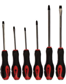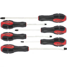 Набор Matrix 19120 из стали CrV состоит из 6 ударных отверток типоразмеров PH1x75, PH2x100, PH3x150, SL5x75, SL6x100, SL8x150. Предназначен для работы с резьбовым крепежом, в том числе для демонтажа перетянутых или заржавевших соединений. У каждой отвертки имеется металлический затыльник, выдерживающий удары молотком или киянкой. Набор рекомендован для профессионального использования и будет полезен во время ремонта оборудования или автотехники. Преимущества Прочность и износостойкость — стержни изготовлены из высококачественной хромованадиевой стали. Повышенная устойчивость к ударным нагрузкам — усиленные стержни шестигранной формы проходят сквозь рукоятки. Антикоррозийная защита — наконечники прошли фосфатирование. Комфортная работа — двухкомпонентные рукоятки с рельефными зонами не выскальзывают из ладони. 1 350,00 ₽ / шт