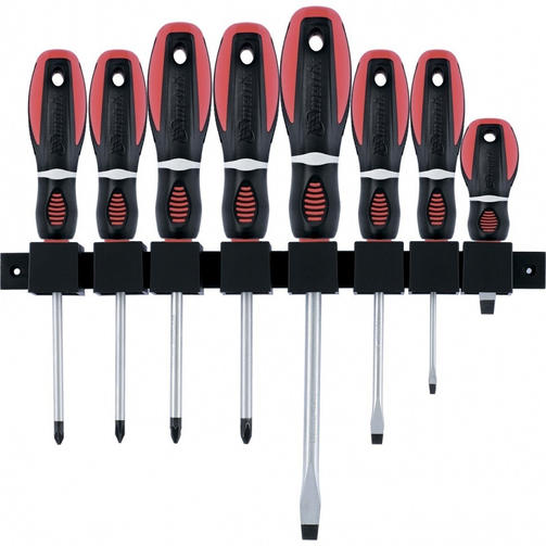 Набор отверток Matrix «Era» 13380 из 8 шт., из стали CrV, с 3-компонентными рукоятками, используется для закручивания и откручивания резьбовых крепежей со шлицами PH и SL. При этом направлять отвертку с насаженным крепежом можно одной рукой, поскольку рабочая часть каждой отвертки намагничена. Набор рекомендован для профессионального применения и будет полезен во время ремонта оборудования и бытовой техники, а также при сборке мебели. Преимущества Стержни отличаются высокой прочностью и долговечностью, т.к. изготовлены из стали хромованадиевой группы. Закаленные рабочие части имеют твердость 50-56 HRC, что обеспечивает отверткам высокий рабочий ресурс. Поверхность стержней хромирована, а наконечники фосфатированы, поэтому инструменты не боятся коррозии. Эргономичные трехкомпонентные рукоятки с насечками на подпальцевых выемках обеспечивают надежный хват, что повышает комфорт во время работы. Отвертки поставляются в комплекте с пластиковой подвесной полкой, что облегчает их хранение. 1 700,00 ₽ / шт