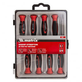 Универсальный набор отверток Matrix 11588 из стали CrV состоит из 8 шт. и предназначен для точных работ с мелкими резьбовыми соединениями. Включает отвертки со шлицами Torx, PH и SL. Набор рекомендован для профессионального использования и будет полезен во время ремонта мобильной техники, компьютеров, часов, очков. Преимущества Долговечность — стержни отверток из стали хромованадиевой группы устойчивы к износу. Комфорт во время работы — эргономичные двухкомпонентные рукоятки удобно лежат в руке, обеспечивая точность движений. Удобство работы в ограниченном пространстве — у каждой отвертки имеется поворотный затыльник, что облегчает вращение инструмента перебором пальцев. 852,00 ₽ / шт