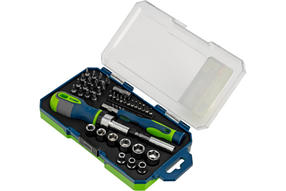 Реверсивные отвертки с набором бит и торцевых головок Сибртех 13338, 41 предмет, CrV, включает в себя насадки для работы с крепежом типа SL, PH, PZ, HEX, TORX и торцевые головки для монтажа/демонтажа гаек, болтов, саморезов. Также в нем есть отвертка и биты для точных работ, с помощью которых можно осуществить ремонт мелкой электроники, очков, детских игрушек и т.д. Удлинитель позволяет проводить работы в труднодоступных местах. Преимущества Прочность и износостойкость — биты, торцевые головки и стержни отверток изготовлены из высококачественной хромованадиевой стали. Функция реверса — легко проводить монтаж/демонтаж крепежа, усталость в руках снижается при больших объемах работ. Эргономичные двухкомпонентные рукоятки — инструменты не проскальзывают в руке. Детали набора не потеряются — инструменты поставляются в пластиковом кейсе на защелке с ложементом. 2 310,00 ₽ / шт