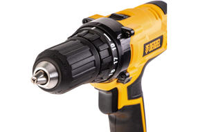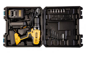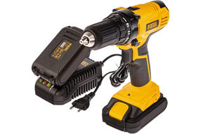 Аккумуляторная дрель-шуруповерт Denzel CDL-IB-18-02 26113 с 2 батареями Li-Ion 18 В, 1,5 А/ч, предназначена для закручивания/откручивания шурупов и винтов, а также для получения отверстий в металле, древесине, пластмассе и других конструкционных материалах. Подойдет для проведения мелких строительных работ и домашнего ремонта. Инструмент имеет два режима вращения 0-350 / 0-1250 об/мин, благодаря чему успешно справляется с разными задачами. Преимущества Надежность — редуктор с металлическими шестернями выдерживает повышенную нагрузку. Точная настройка — 19+1 ступень регулировки крутящего момента позволяет выбора оптимальное усилия затягивания крепежа. Аккуратная работа — тормоз свободного выбега мгновенно останавливает двигатель после отключения, что позволяет избежать перетяжки крепежа. Легкая замена оснастки — благодаря функции блокировки шпинделя установить биту или сверло можно одной рукой. LED-подсветка рабочей зоны — инструментом удобно работать даже в условиях плохого освещения. Бесперебойная работа — инструмент поставляется с 2 аккумуляторами емкостью 1,5 А/ч. Универсальность — аккумулятор 1,5 Ач Li-ion совместим с любым инструментом 18V Denzel battery system серии IB. Быстрая зарядка — аккумуляторная батарея вновь готова к работе всего через 1 час. Комфортная эксплуатация — эргономичная рукоятка удобно лежит в руке, а резиновая накладка уменьшает вибрацию. Полная комплектация — к дрели-шуруповерту прилагаются сверла по металлу и биты наиболее популярных размеров. 10 100,00 ₽ / шт