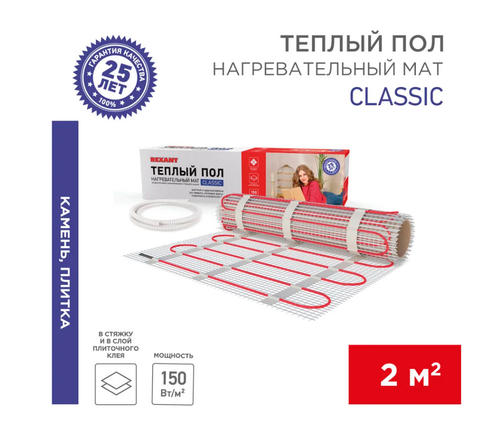 Теплый пол, нагревательный мат REXANT Classic RNX-2-300, двухжильный, с экраном, площадь 2м2,0,5х4