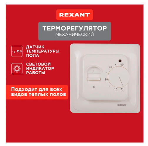 Механический термостат R70XT от REXANT белого цвета обеспечивает регулировку температуры в диапазоне от +5°C до +40°C. Имеет высокую коммутационную способность контактов до 16 А (3500 Вт), что позволяет использовать его для управления большим количеством электроприборов. Одним из преимуществ механического термостата является наличие выносного датчика температуры на проводе (устанавливается в зоне обогрева). Это позволяет точнее контролировать температуру в помещении и обеспечить комфортную атмосферу. Подходит для использования в различных областях, включая домашнее и офисное применение. Легко устанавливается и прост в использовании. Конструкция предусматривает механическое управление с помощью регулятора на корпусе. Выносной датчик температуры пола 3 м 949,00 ₽ / шт