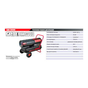 Дизельная тепловая пушка Edon GAH-30000 - это высококачественное оборудование, предназначенное для быстрого и эффективного обогрева нежилых вентилируемых помещений. Тепловая пушка дизельная Edon GAH-30000 предназначена для генерации горячего воздуха, который может быть использован для направленного обогрева, сушки промышленных, складских, вспомогательных помещений и т.д. Тепловая пушка работает на дизельном топливе и требует подключения к электросети для функционирования автоматики. Особенности: - электронная плата управления; - указатель уровня топлива; - большая площадь отопления. Основные параметры: напряжение питания - 220 В.; максимальная тепловая мощность - 30 кВт.; площадь отапливаемого помещения - от 120 до 200 м2.; производительность по воздуху - 720 м3/час.; тип топлива - солярка/керосин; объем топливного бака - 38 л.; номинальный расход топлива - 2.39 л/час.; вес оборудования - 24.0 кг. Габаритные размеры упаковки: 850х390х470 мм.; Вес брутто: 25.0 кг (Вес c упаковкой).Есть в наличии Доставка по городу и области Возврат или обмен в течение 14 дней*